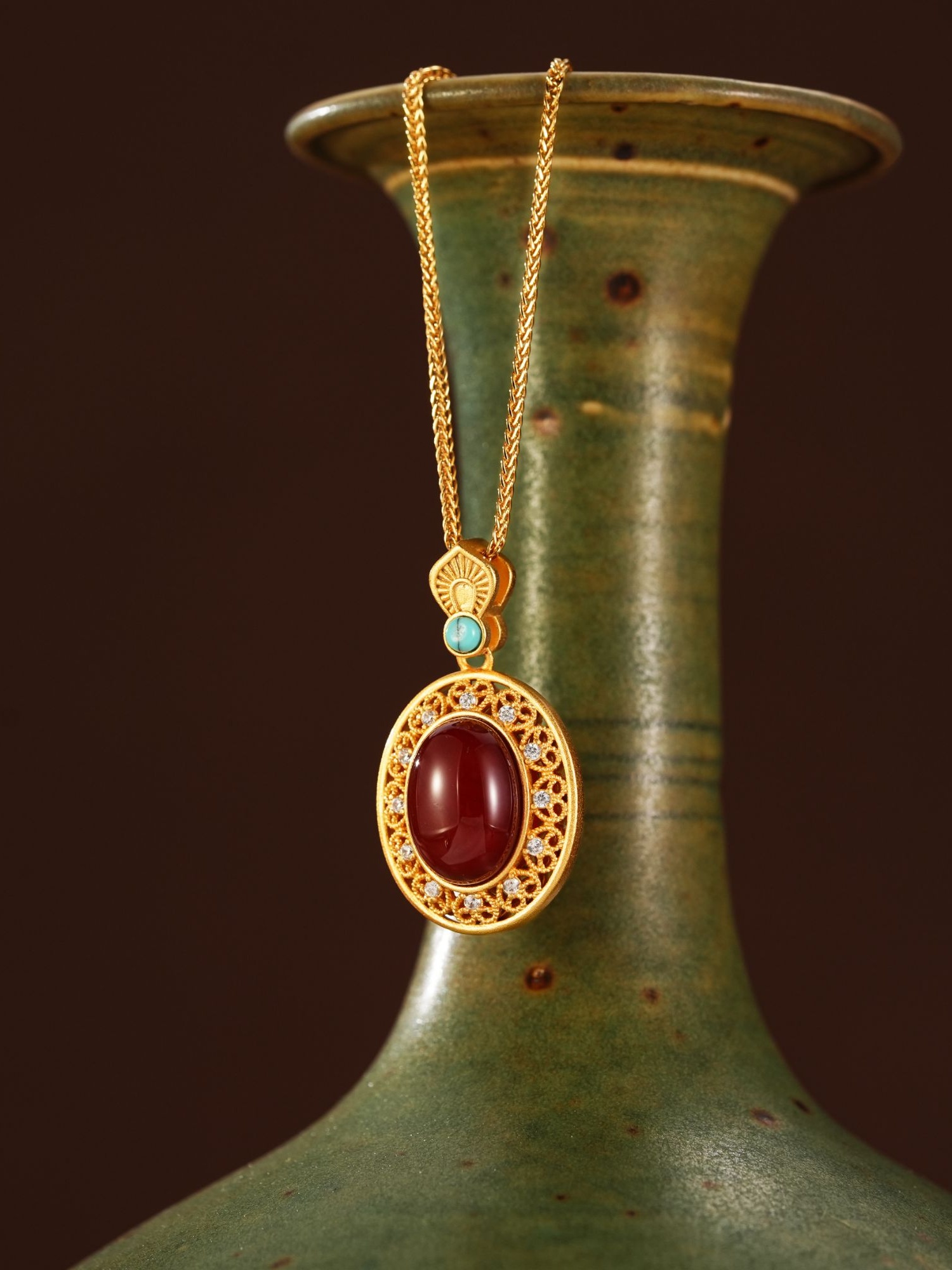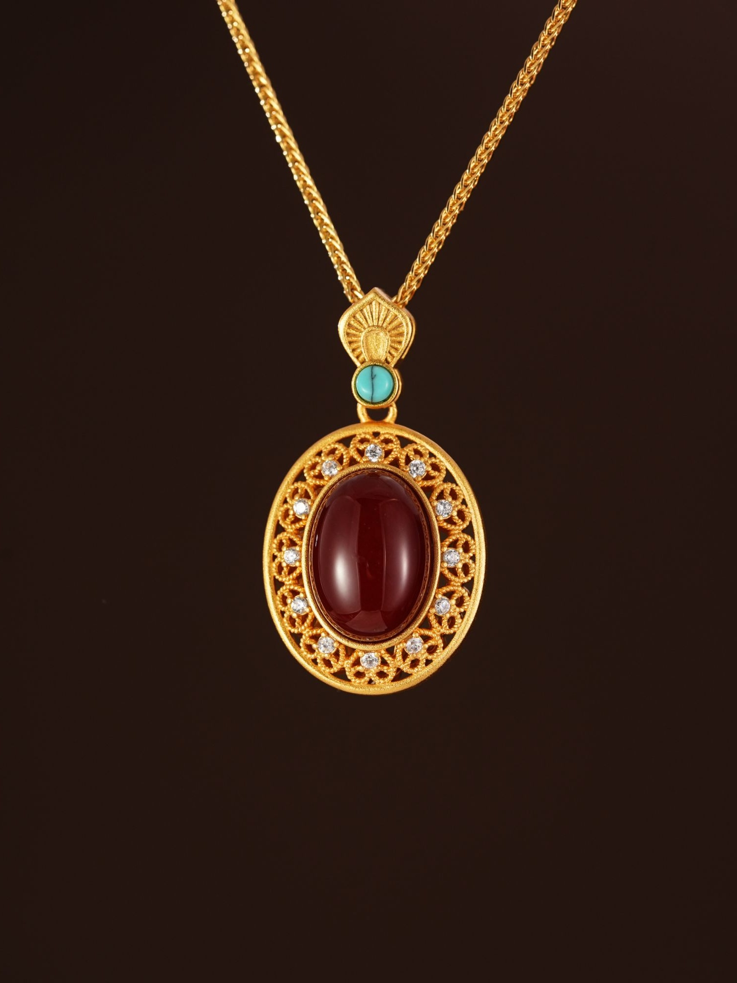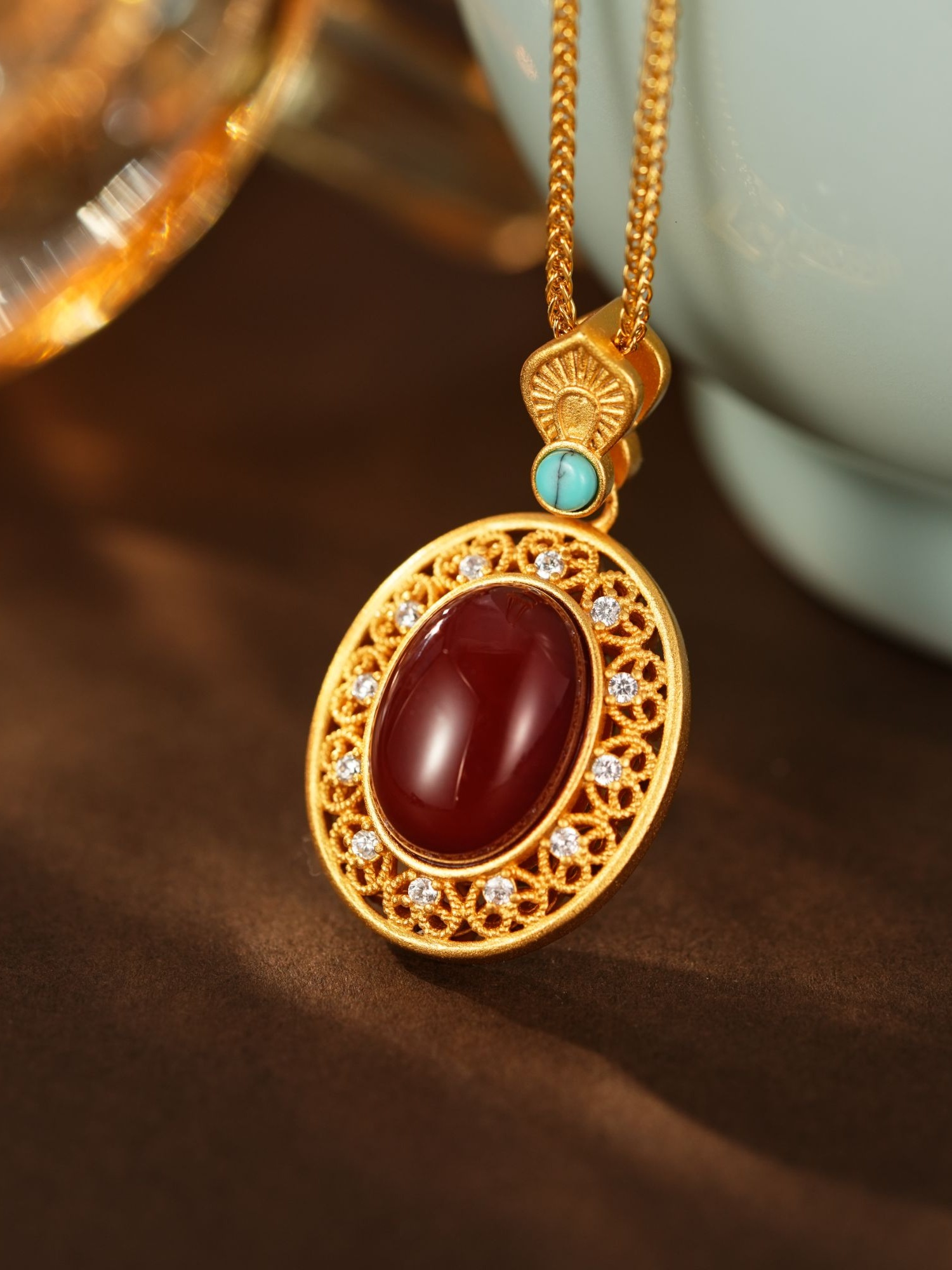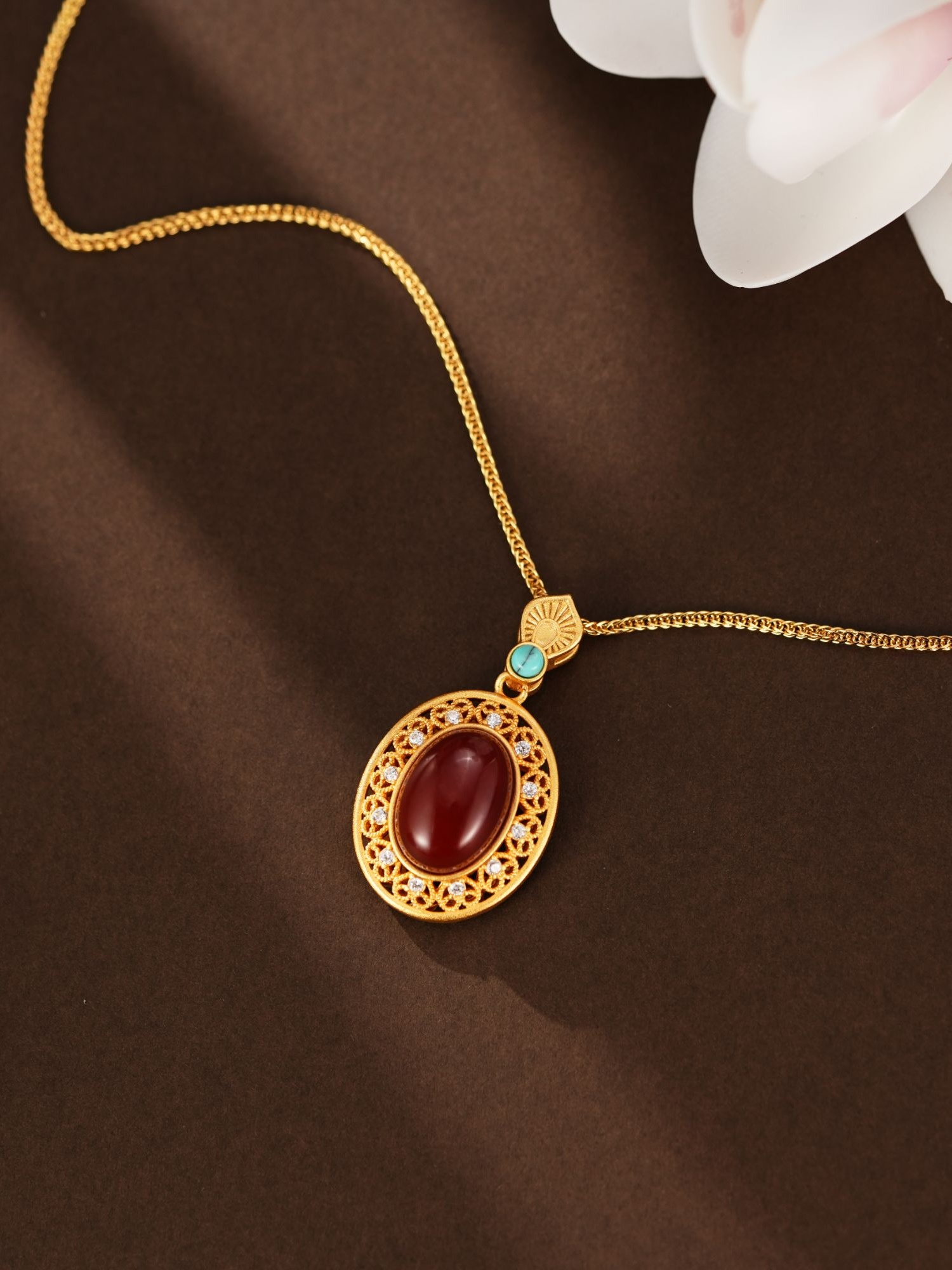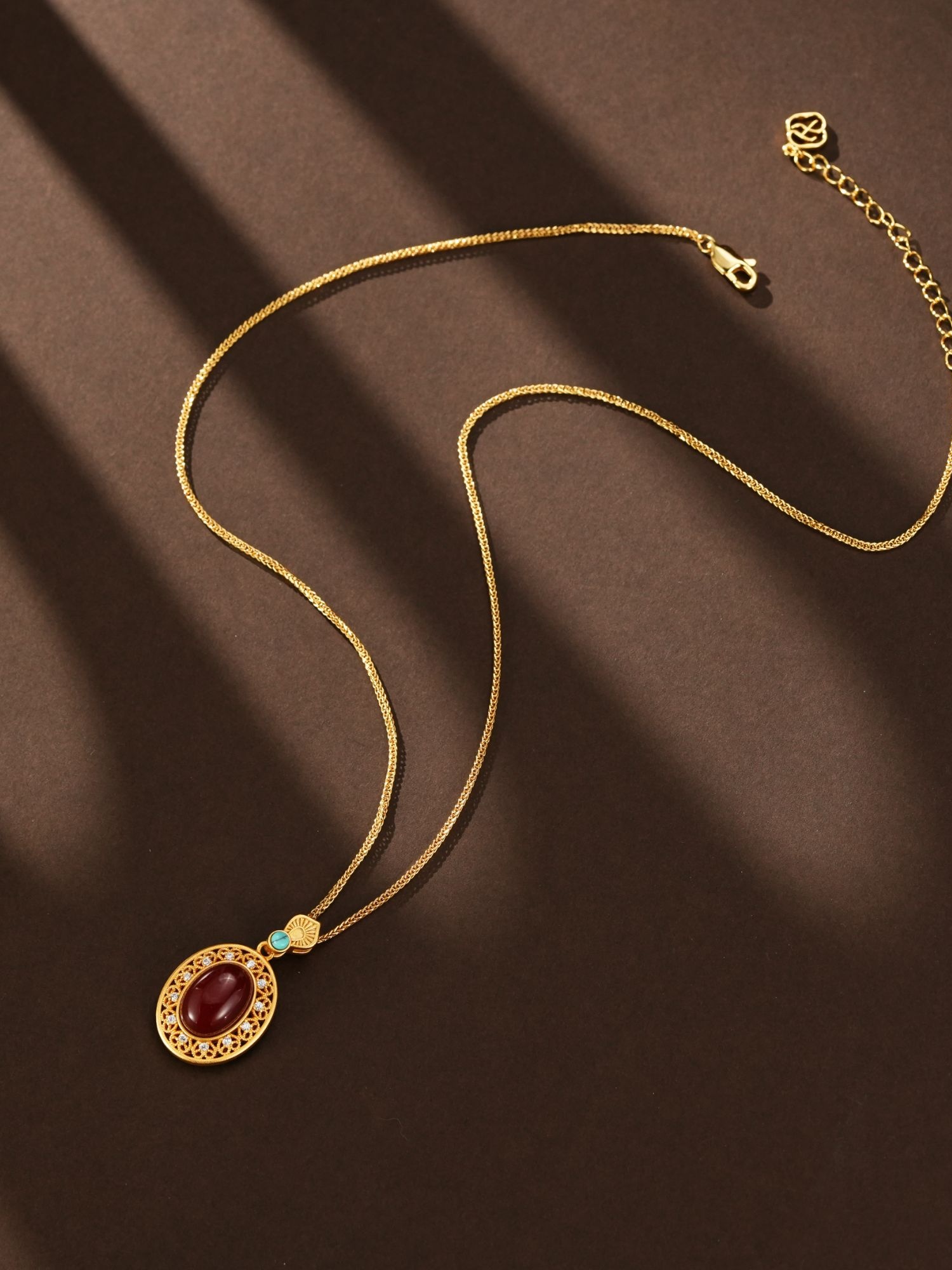 设计感复古镂空花边红色椭圆项链小众国风时尚项链